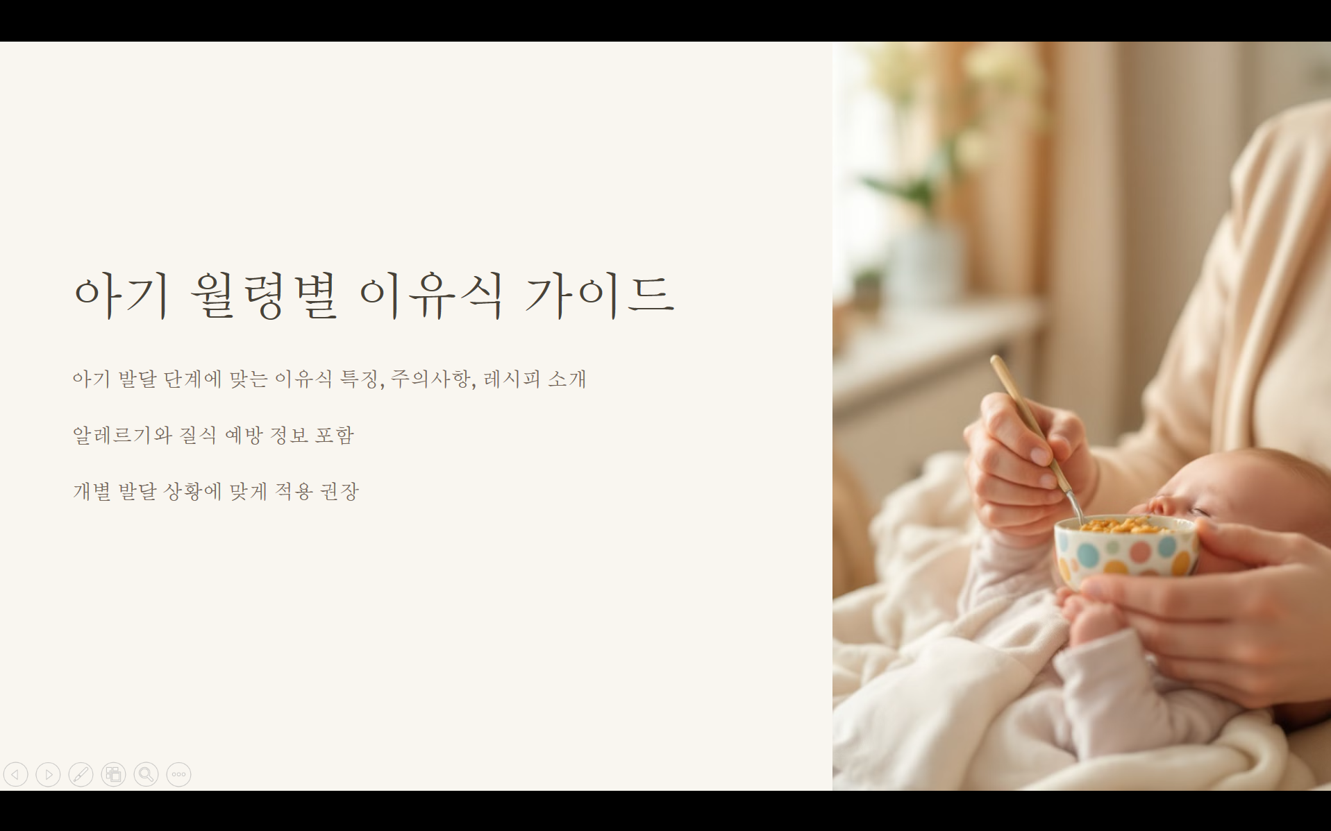이 가이드에서는 아기의 월령에 맞는 이유식 단계별 특징과 중요한 주의사항, 그리고 실제 활용할 수 있는 레시피를 담았습니다. 특히 알레르기와 질식 예방에 관한 부분을 꼼꼼히 살펴보시고, 아이의 개별적인 발달 상황에 맞게 적용하시는 것이 좋습니다.